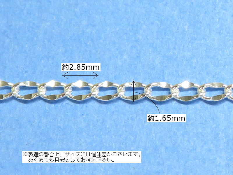 目安寸法 鎖の幅(外径)1.65mm/線径0.35mm/1コマの長さ2.85mm/厚みmm