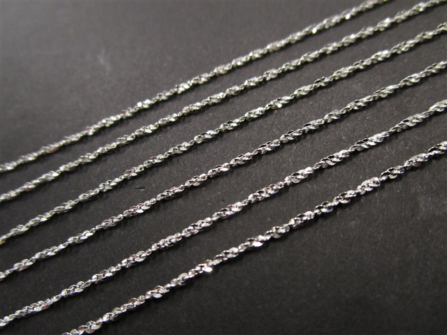 フラット(潰し)加工の小豆チェーンに緩やかなネジリ加工をし、きらきらと光を乱反射するよう仕上げました。華奢ながら、離れて見ても輝きが際立つ一押しのチェーンです。
