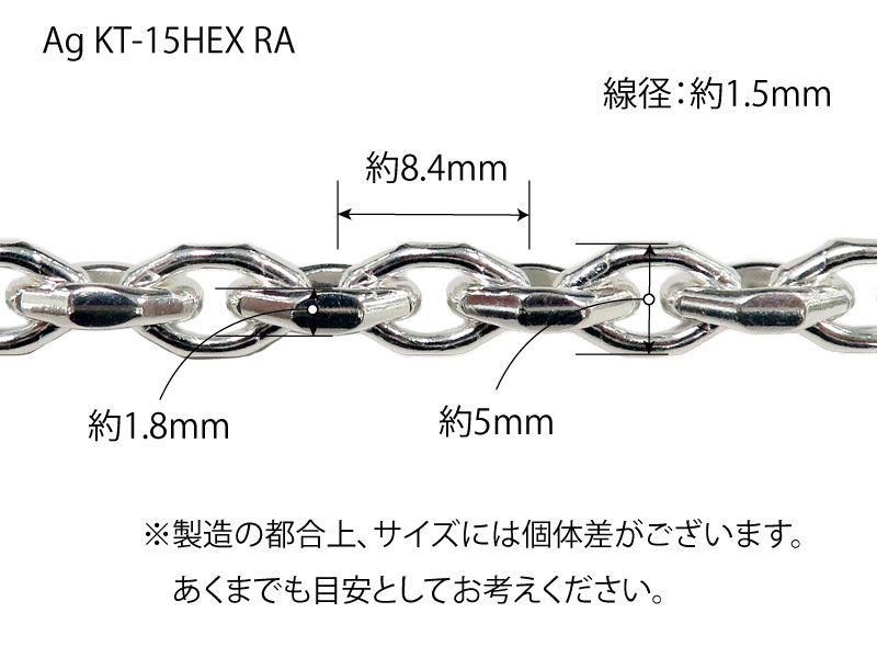 目安寸法 鎖の幅(外径)5.0mm/線径1.5mm/1コマの長さ8.4mm