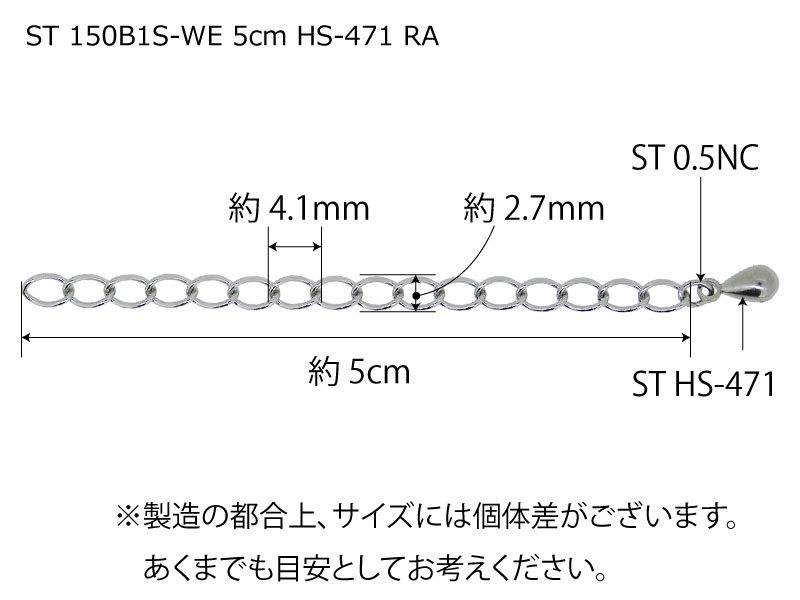 鎖寸法 鎖の幅(外径)2.7mm/線径0.5mm/1コマの長さ4.1mm/厚み1.3mm