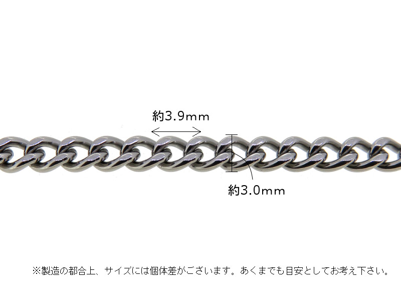 目安寸法 鎖の幅(外径)3mm/線径0.8mm/1コマの長さ3.9mm/厚み1.6mm