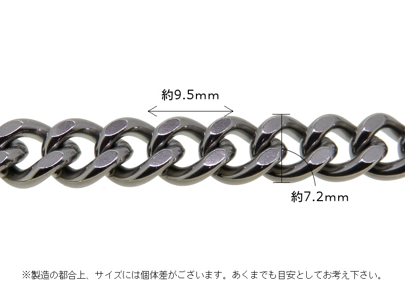 目安寸法 鎖の幅(外径)7.2mm/線径2mm/1コマの長さ9.5mm/厚み3.75mm
