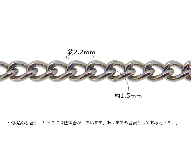 目安寸法 鎖の幅(外径)1.5mm/線径0.45mm/1コマの長さ2.2mm/厚み1mm